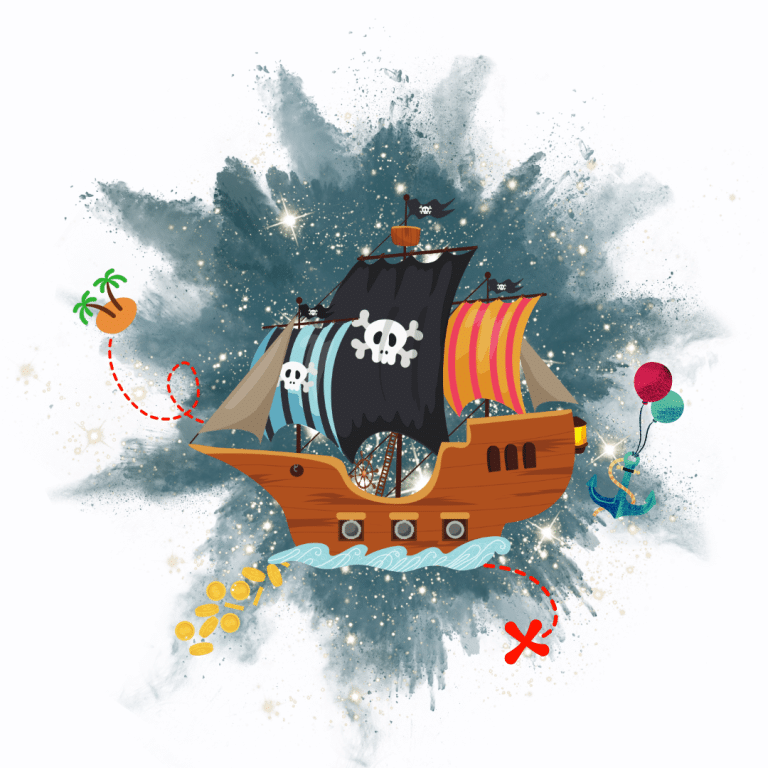 En piratfylt bursdag med spennende eventyr! Barna drar pÄ sjÞdyrjakt, fÞlger skattekart pÄ leting etter skatten, maler sitt eget sjÞrÞverflagg og danser til Kaptein Sabeltann i sÄpebobledisco.