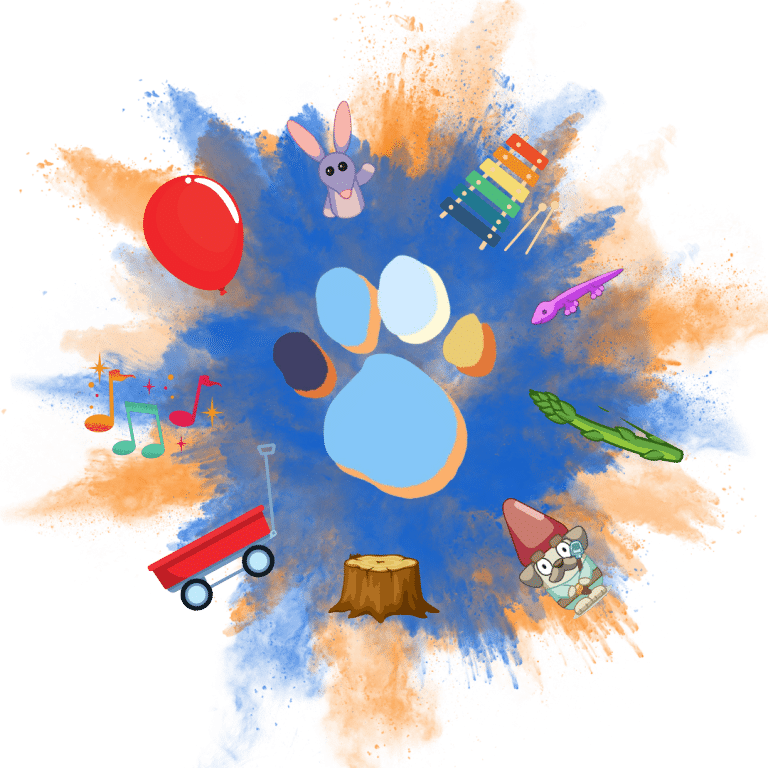 En leken Bluey-bursdag full av aktiviteter! Barna deltar i morsomme leker som ballonglek, musikkstatuer, "magisk asparges"-lek og nappe hale, og lager egne smykker i Bluey-farger.